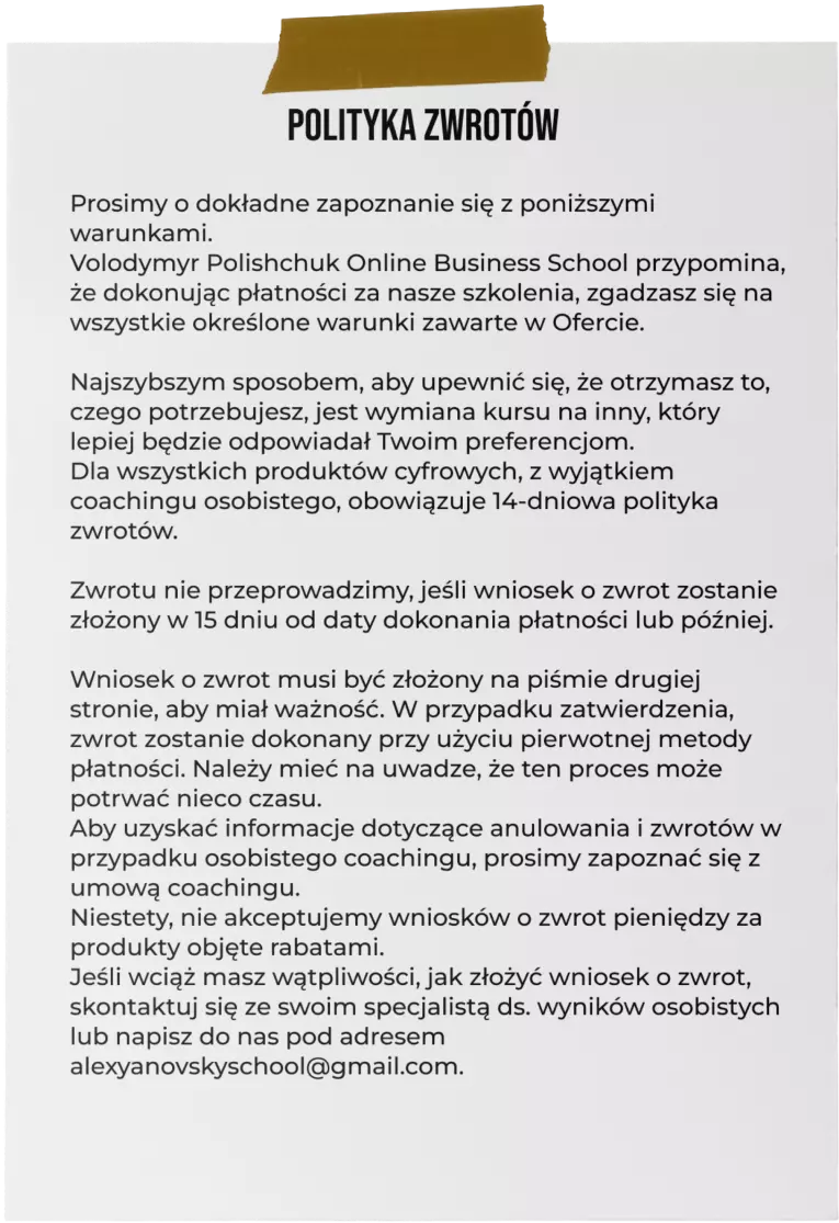 - Po dokonaniu przez Klienta płatności za wybrany kurs, Wykonawca wyśle na adres e-mail Klienta, podany podczas rejestracji, link z zaproszeniem do dołączenia do kanału Telegram lub konferencji online (szkolenia). Ten link będzie również służył jako potwierdzenie usługi oraz podstawa do wystawienia faktury.